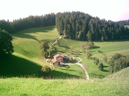 Unser Betrieb liegt auf 826 m ü. M., in der Gemeinde Hergiswil am Napf, in der Bergzone II. Wir haben eine landwirtschaftliche Nutzfläche von 10.01 Hektare, 3.6 Hektaren Waldfläche und 1 Hektar unproduktive Fläche (Strassen, Bäche und Gebäude).